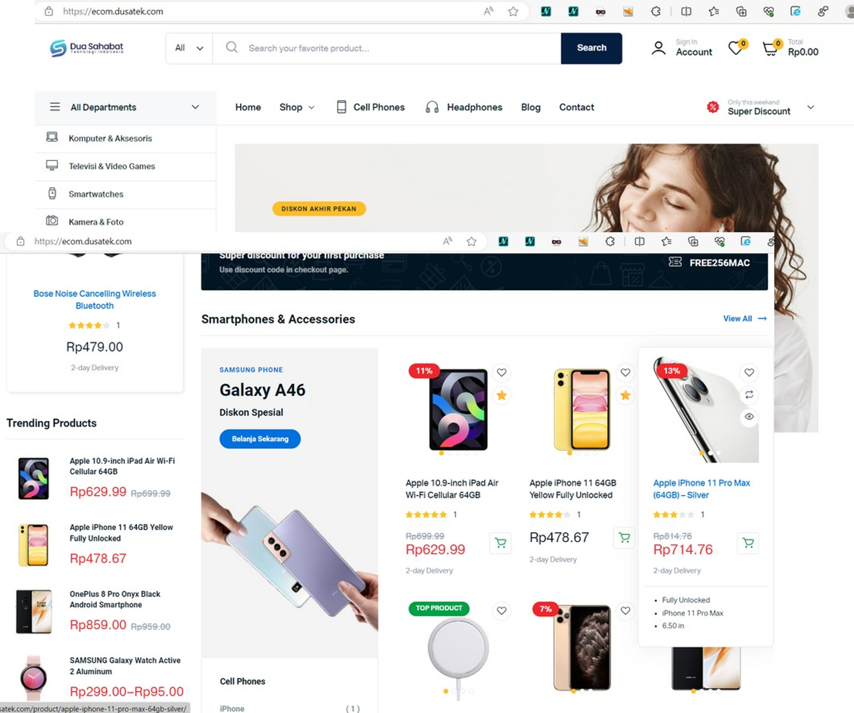 PT Dusatek collaborates with several agencies to serve the development of E-commerce for electronic devices such as smartphones and tablets which are bundled with predetermined specifications. The development of this E-commerce portal can only be accessed by members of related agencies and institutions, which have been integrated with several payment methods such as virtual banking, credit cards, Online Debit and even integrated with online installments.